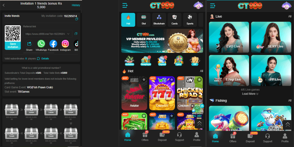 CT999 heavily promotes referrals. Users get invite links, and rewards unlock when invited users play and stay active.